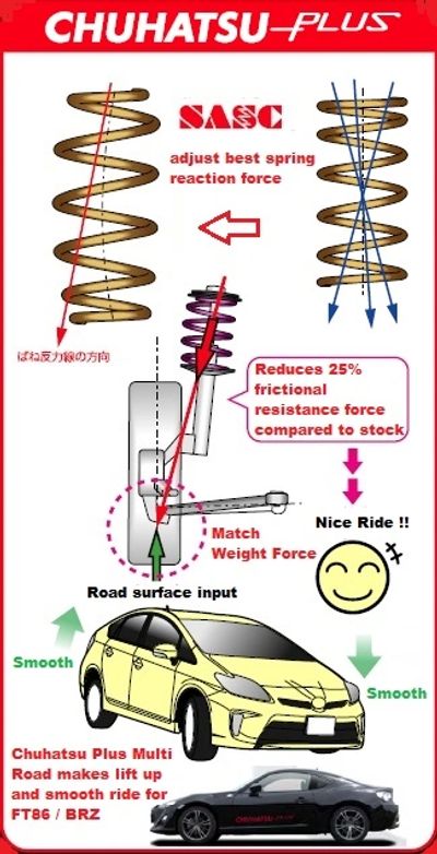 Chuhatsu is TOYOTA OEM spring company has proprietary technology. SASC = Side Action Spring helps your shock makes perfect damping from any spring reaction force. It reduces 25% frictional resistance force compared to stock: improving ride and very smoothly.