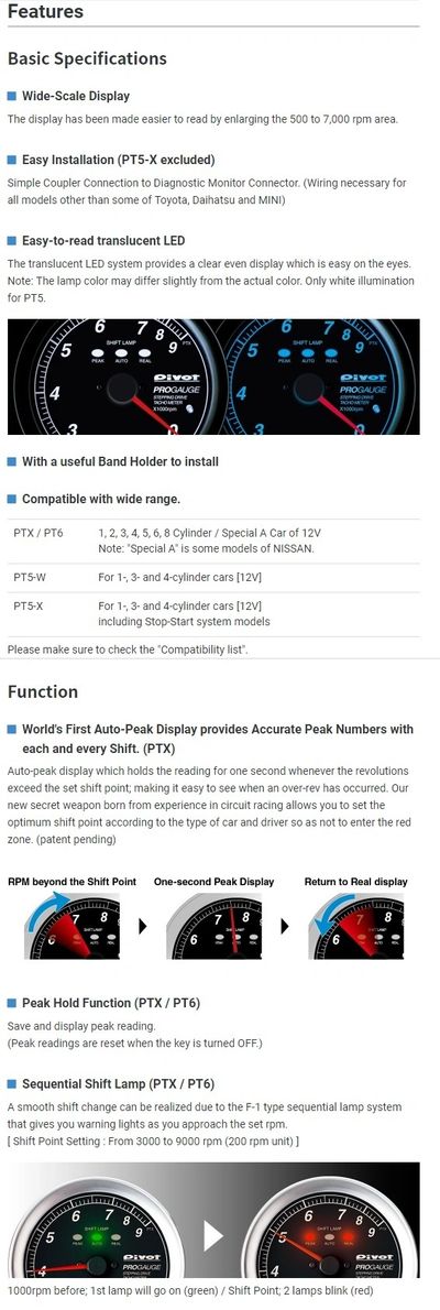 Auto-peak display which holds the reading for one second whenever the revolutions exceed the set shift point; making it easy to see when an over-rev has occurred. Our new secret weapon born from experience in race track allows you to set the optimum point according to the type of car and drive so as not to enter the red zone.